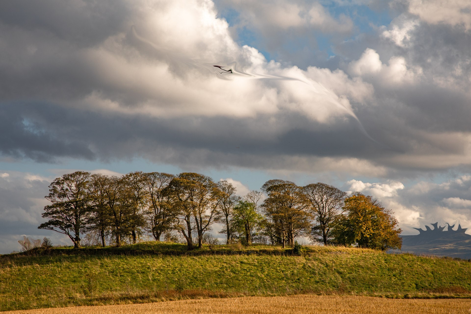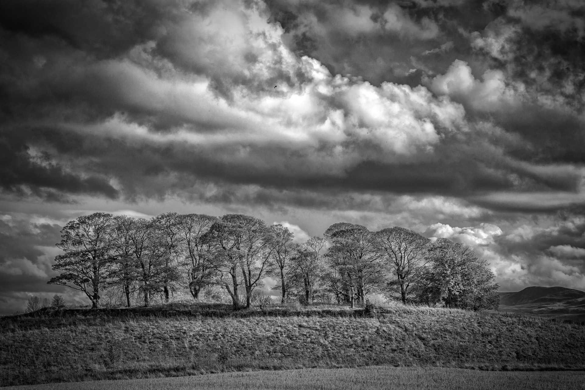 - Burned top 1/3rd to emphasise the clouds and a wee bit of dodging bottom right to lift the distant hills.