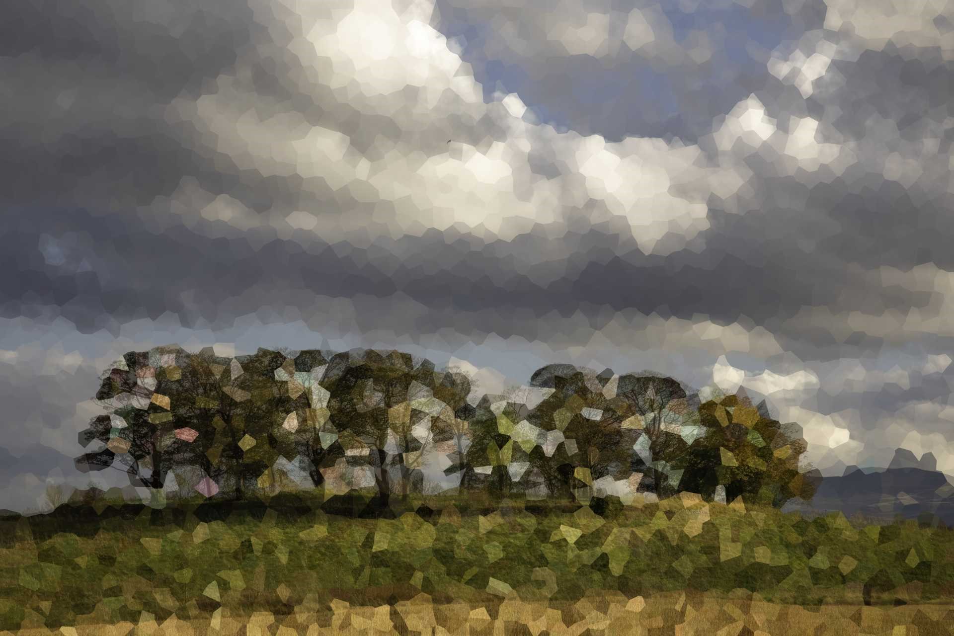 Edit in Photoshop: create a duplicate layer and apply the Crystallize filter to it. Then reduce the Opacity of this new layer to about 50% so the trees in the background layer just show through. All done!