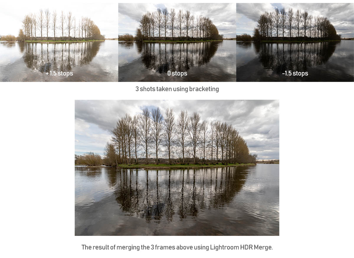 In the example on the right, the original shot, taken with the recommended exposure, had poor detail in highlight and shadow areas. I then took 3 bracketed shots with exposure set at -1.5 stops, 0 stops and +1.5 stops. These were merged in Lightroom using HDR merge. The merged shot was then edited in Lightroom and Photoshop.